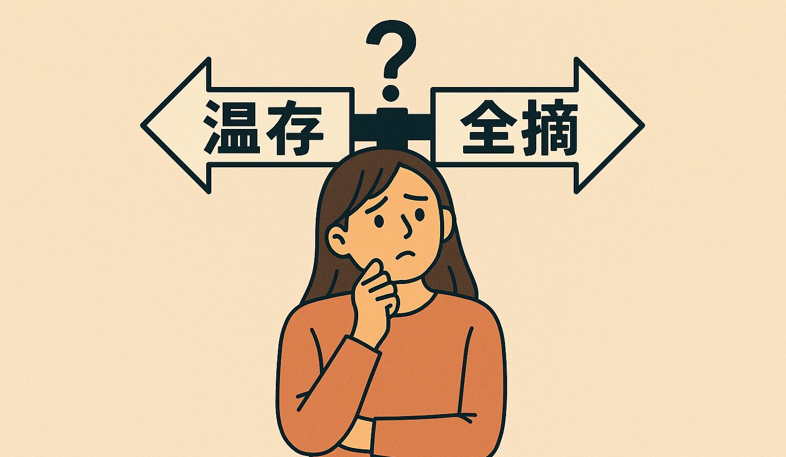 ここから先は、実際に手術を受けた後に考えたことです。もしも再建まで視野に入れる程度に乳房が気に入っているなら、無理なく温存できる大きさ、範囲だと説明を受けたなら、温存手術を個人的にお勧めします。結局は遠隔の転移にはどちらも差はなく、局所の再発率の違いでしかないようです。私のように、非浸潤癌と予測されて、温存できるけど全摘と迷う方は、温存がお勧めです。乳房は必要ないという方はスッキリ全摘が不安がないかもしれませんが、後から再建を考える方なら、温存できる場合は温存した方が良いと思います。もちろん、場所が悪くて温存手術の適応がないなら仕方ありません。全摘の経験がないのに恐縮ですが、とってしまうと元に戻せない、ということと、上手な先生の温存手術は本当に綺麗で、言われないと手術したことがそんなにわからないくらいでした。